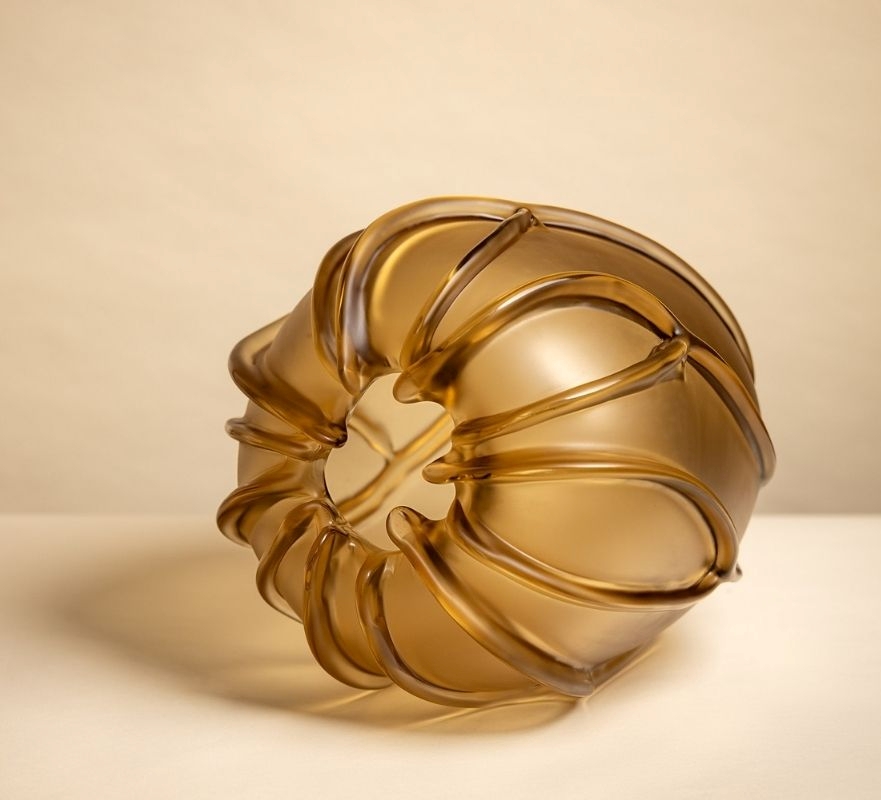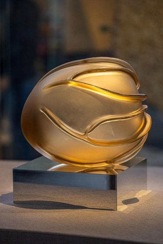 Between contemporary glass and classical statuary, a plastic tension unfolds where vitreous matter transcends stillness, emerging as form shaped by light and depth.