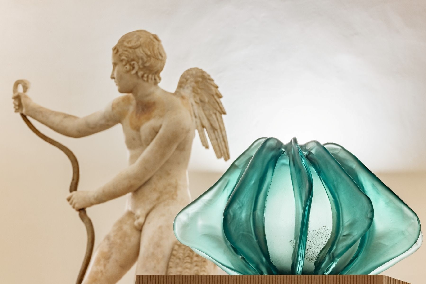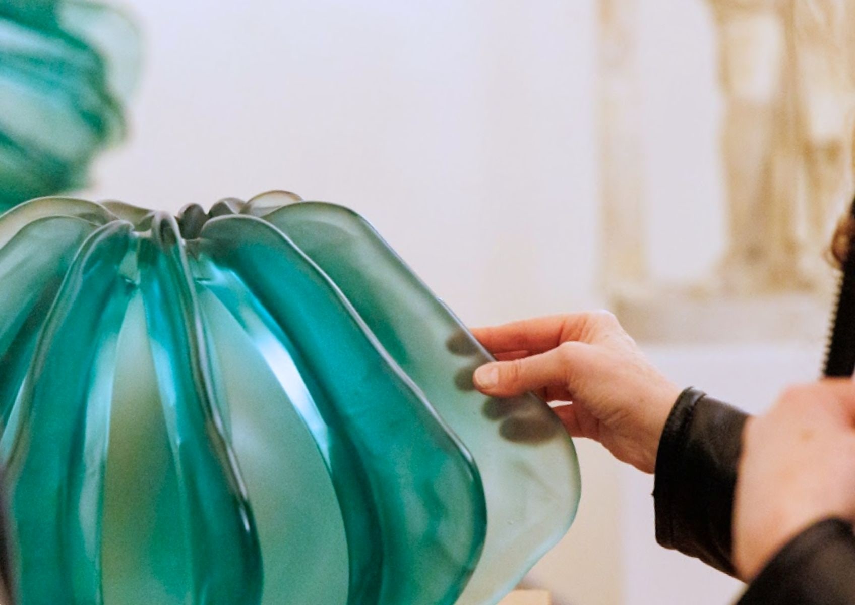 Suspended between water and air, the dragonfly becomes the formal matrix of a sculptural presence in blown glass.